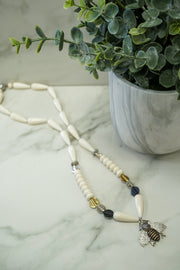 A fun & creative handmade necklace, with bone and CZ beads. Paired perfectly with a gorgeous bee pendant accent. (14 Inch Necklace)