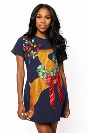 The Queen Of Sparkles Navy Rhinestone Rudolph Tee Dress is a merry mini made to shine all season long. Crafted in a relaxed fit with a classic crew neckline and short sleeves, it’s the perfect balance of casual comfort and holiday sparkle. The rhinestone-embellished Rudolph, complete with a festive wreath, makes this dress a standout piece for Christmas parties, gatherings, or cozy nights in.